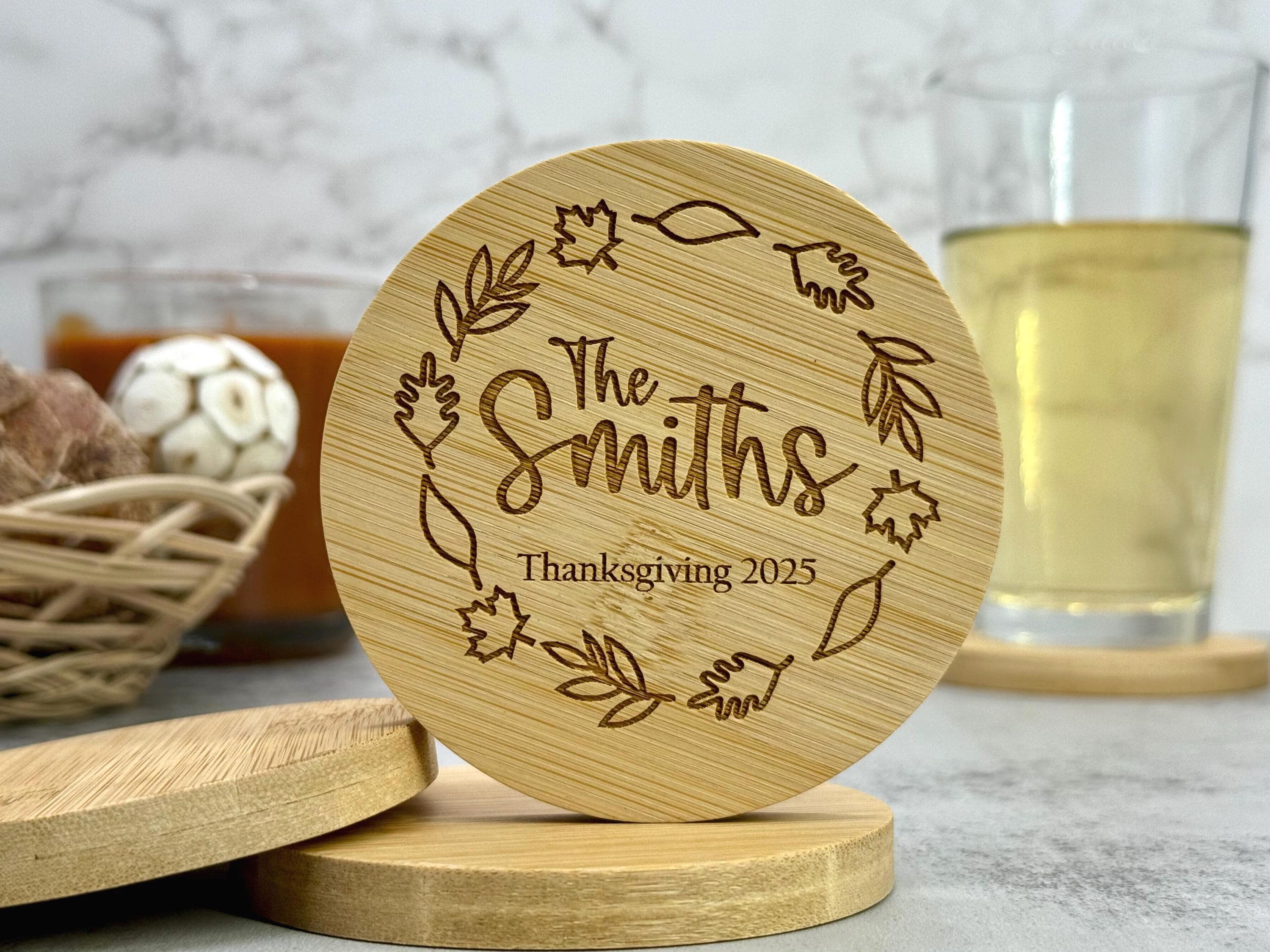Bring warmth and charm to your Thanksgiving celebration with our personalized bamboo coasters, available in round or square shapes. Each coaster features a festive design and can be personalized with your family name and the year you're celebrating, making it a meaningful keepsake for the season. Made from natural bamboo, they’re a beautiful and eco-friendly way to dress up your holiday table or gift to loved ones. Make your gatherings extra special with a touch of personal flair!