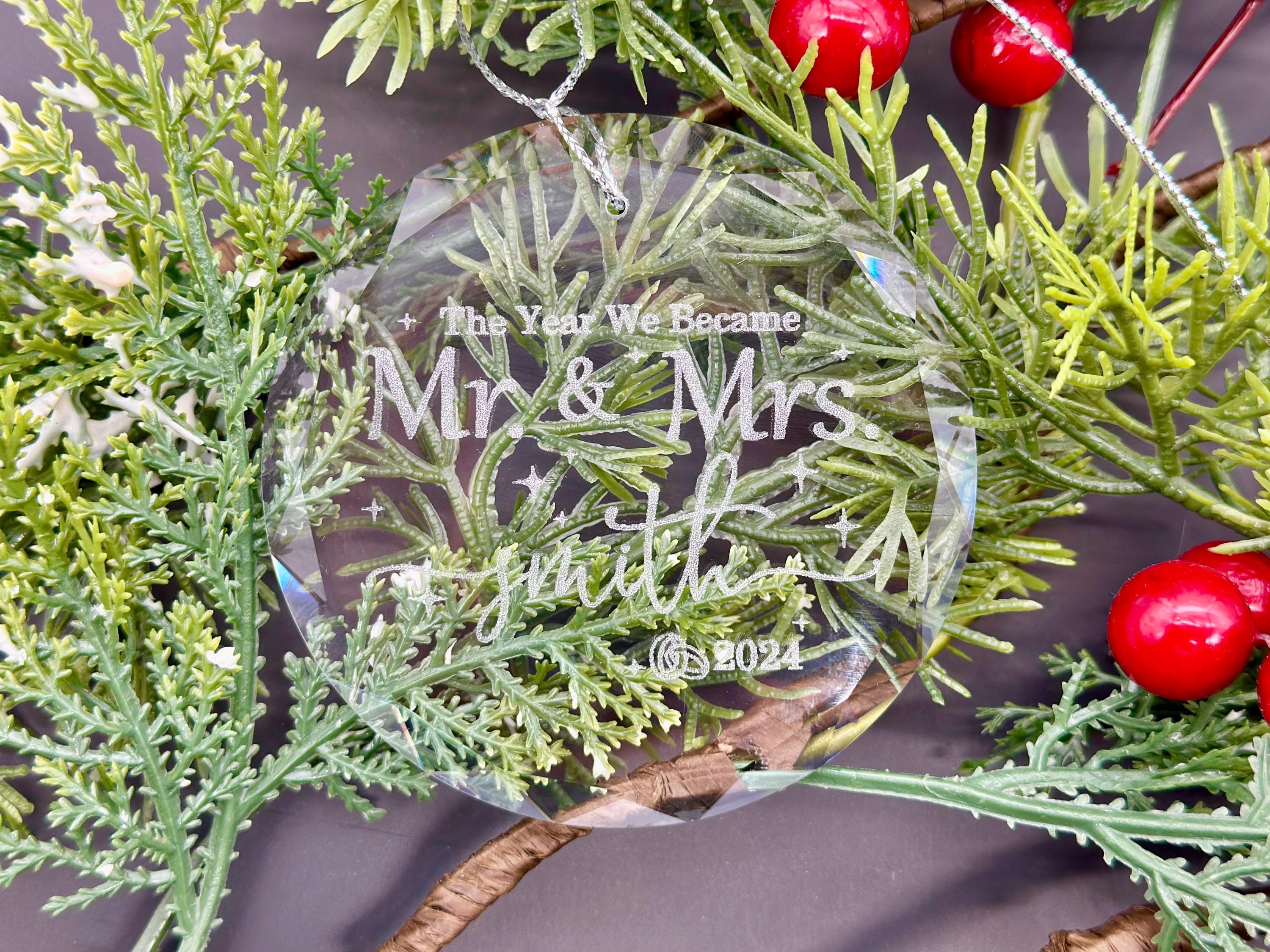 Celebrate your first Christmas as a married couple with a keepsake as timeless as your love. This elegant glass ornament is personalized with your names and wedding year — a beautiful reminder of your first holiday season together. Comes ready to gift in a keepsake box, perfect for tree-trimming or gifting to newlyweds.